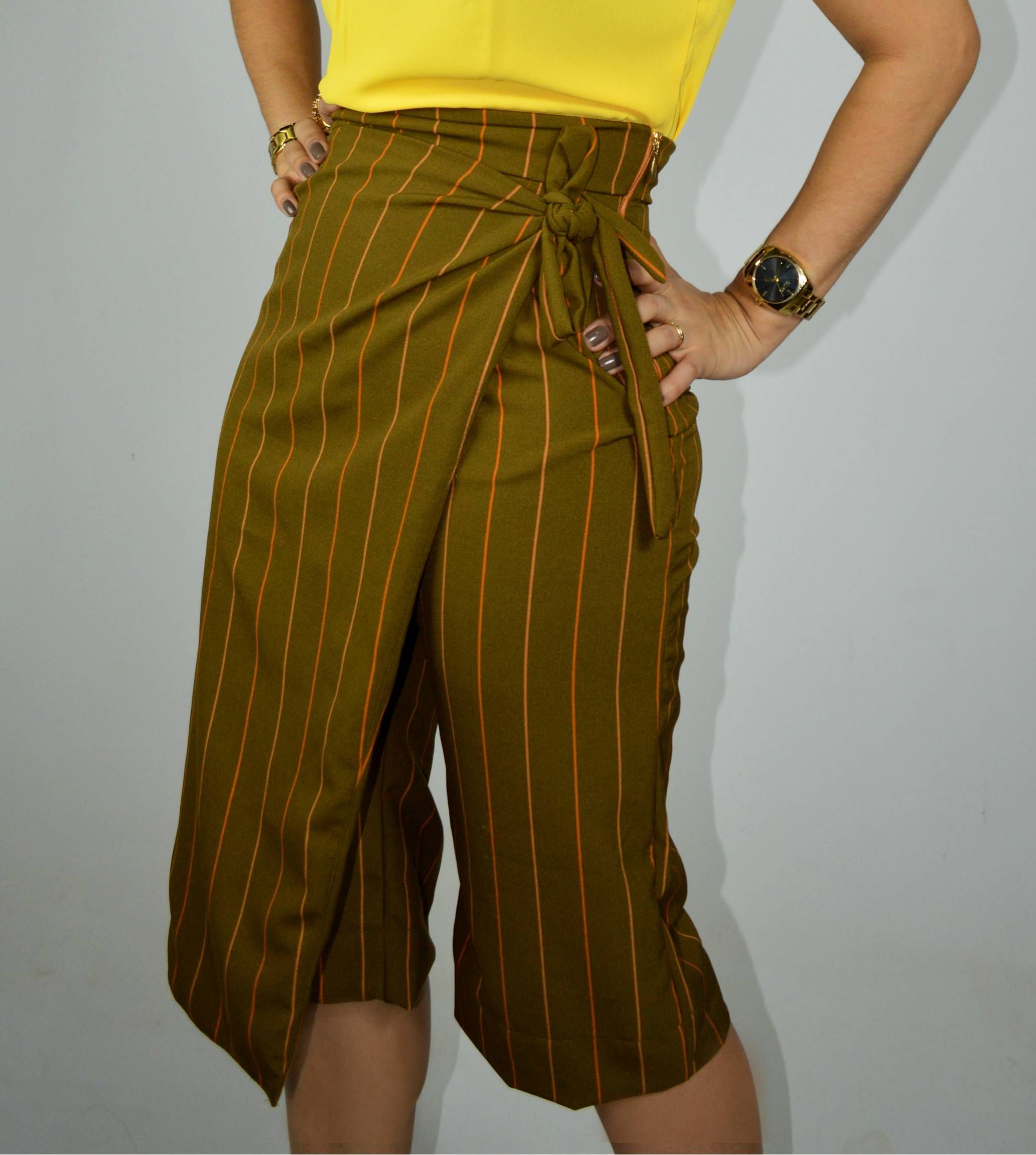 Bermuda Crepe Encorpado Listrada Verde Lodo Envelhecido com Corte Assimétrico Frontal e Bolsos Verdugos