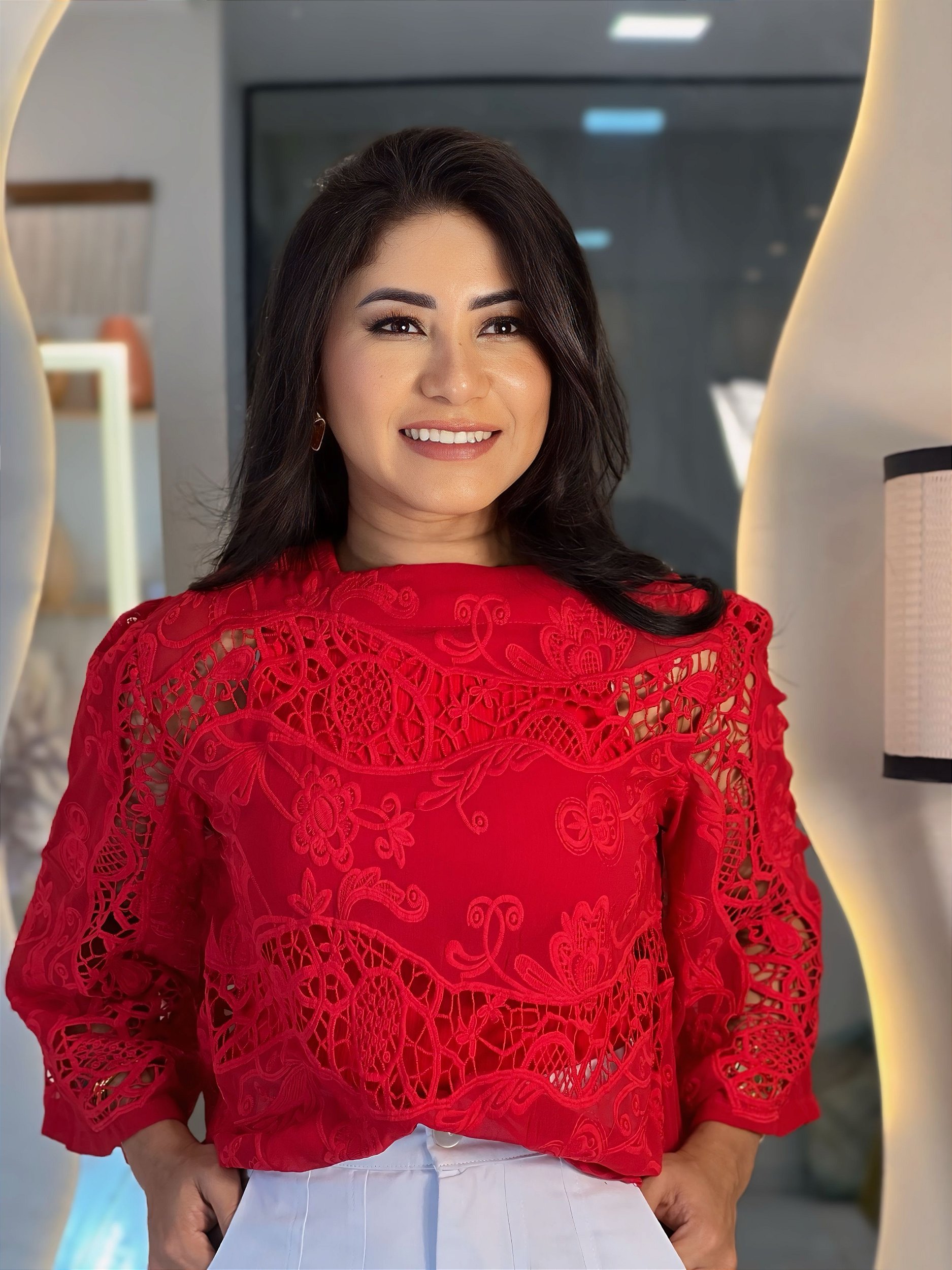 Blusa Shifon Bordado Vermelha Renda Manga Evasê Cropped Gola Barca