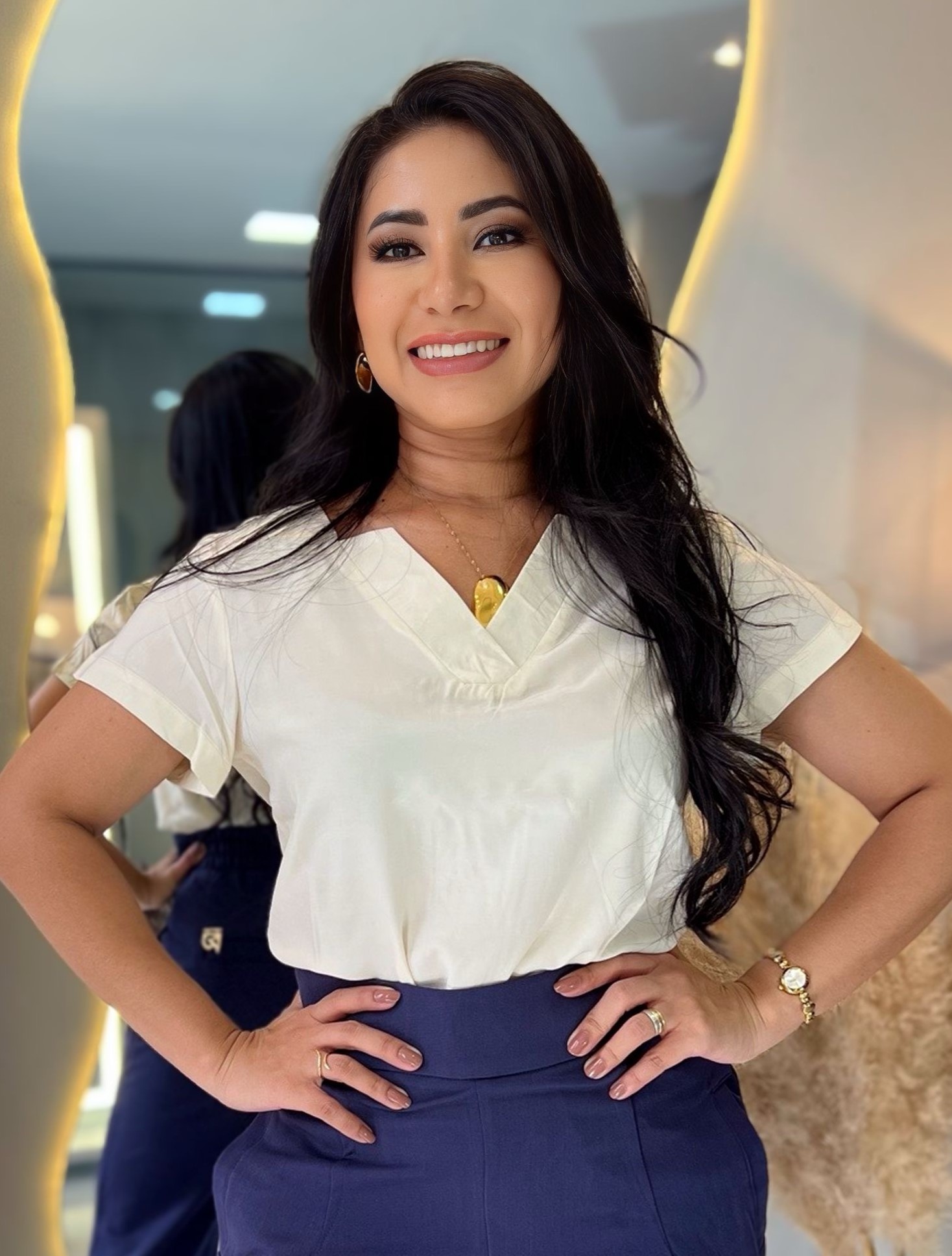• Decote V Assimétrico: Valoriza o colo com um toque moderno e sofisticado.