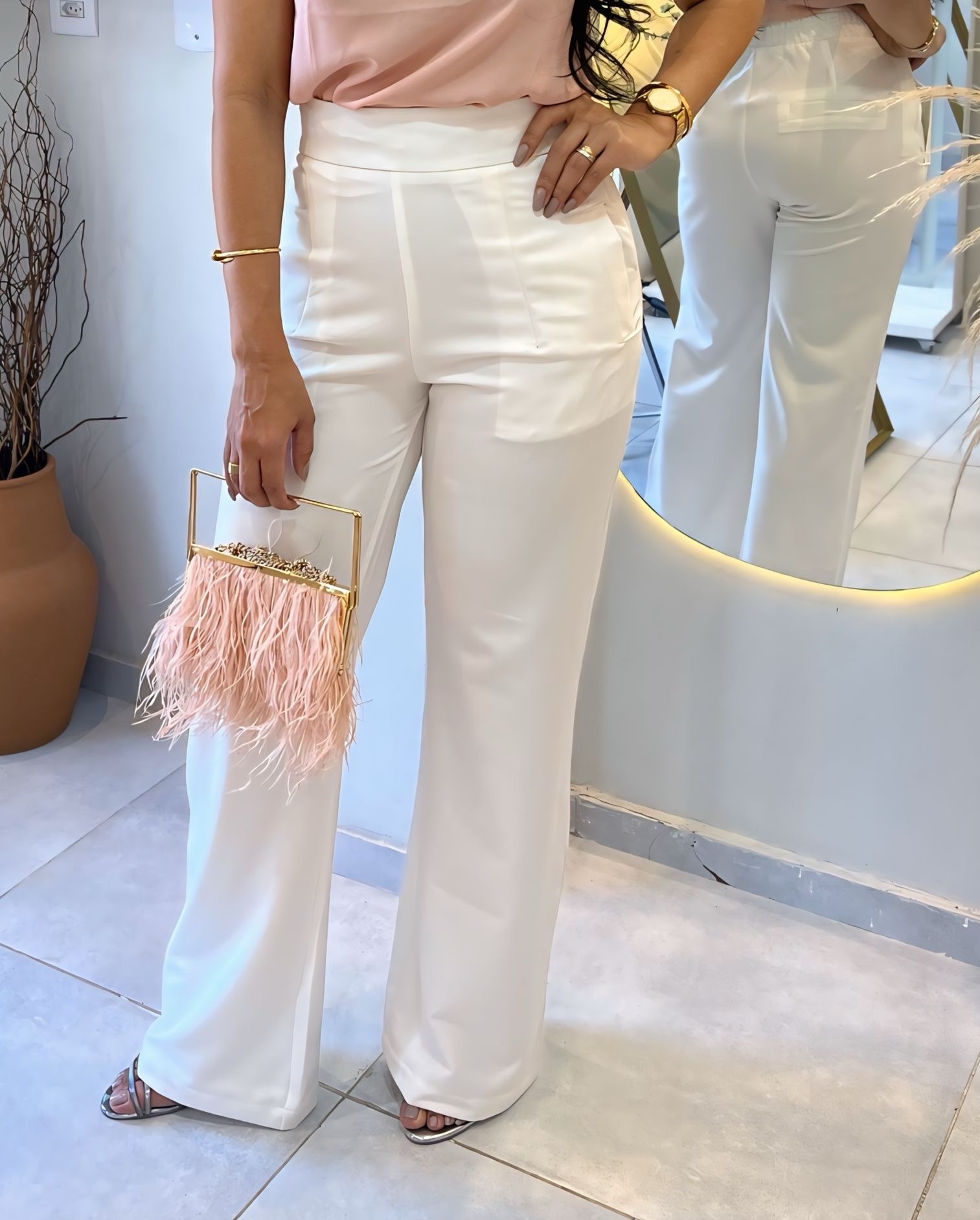 Calça Alfaiataria Mônaco Off White Pantalona Com Bolsos Verdugos Frente E Atrás, Elástico Na Cintura