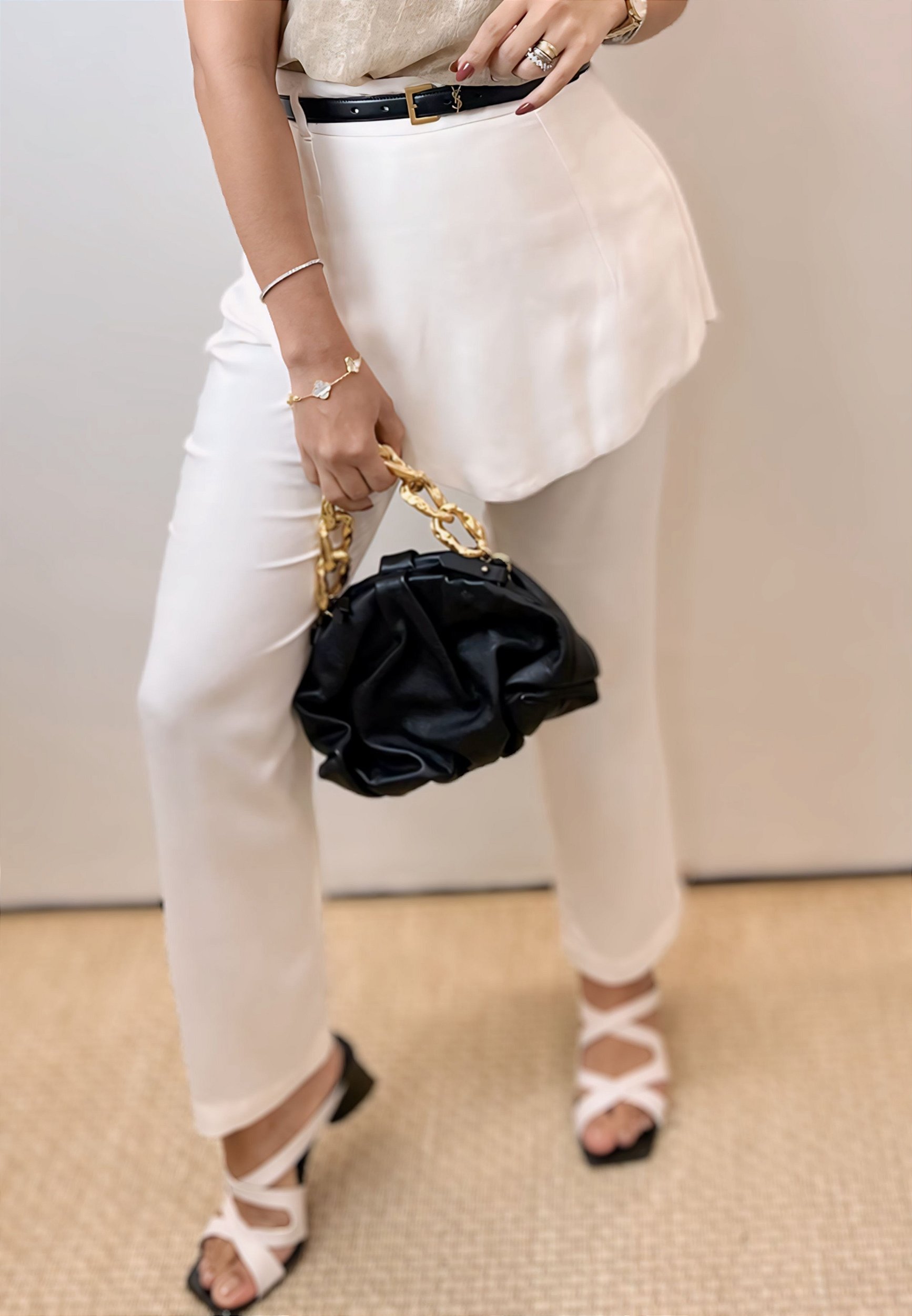 O destaque dessa calça é a sobreposição assimétrica que acrescenta uma dose de modernidade e estilo ao seu look.