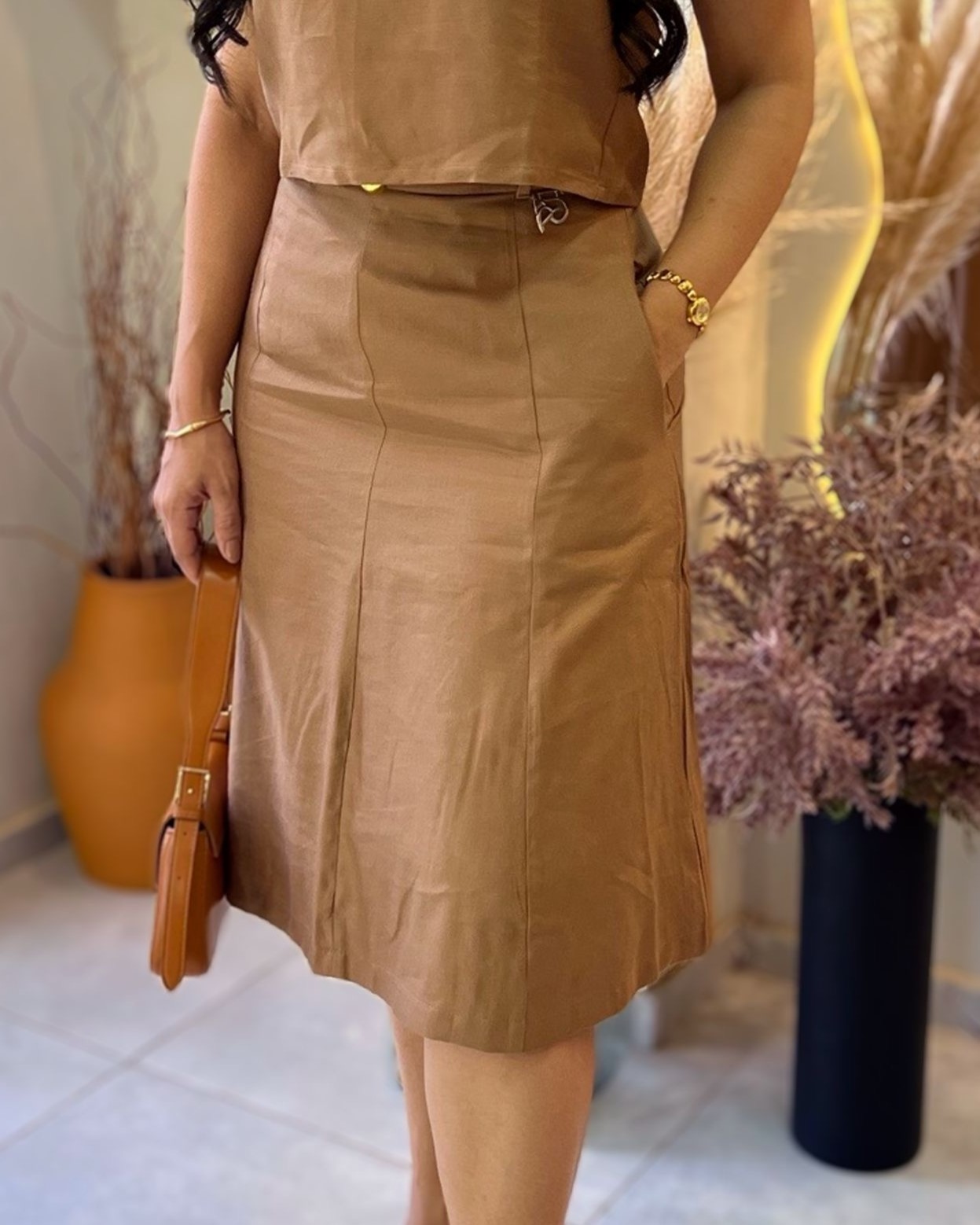 • Saia em Linho Evasê com Recortes: Modelagem que valoriza a silhueta com movimento leve e elegante.