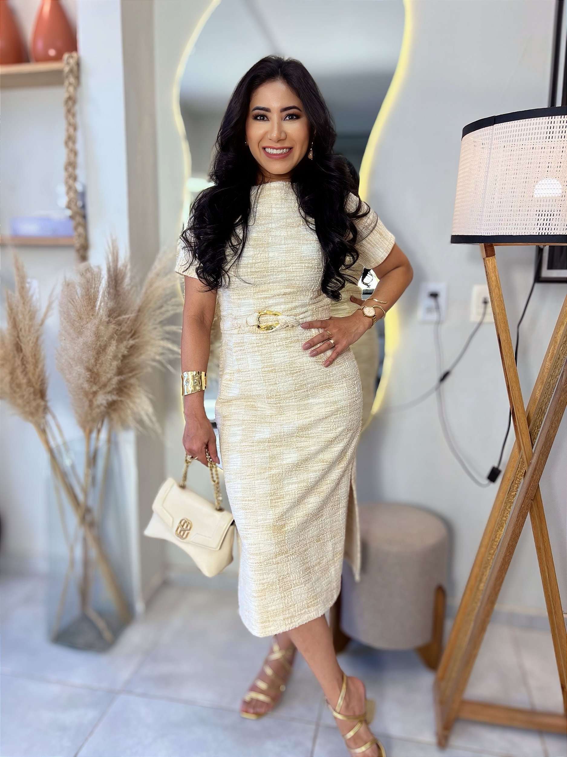Vestido Malha Tweed Natural Comprimento Midi Com Fendas Laterais